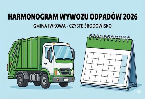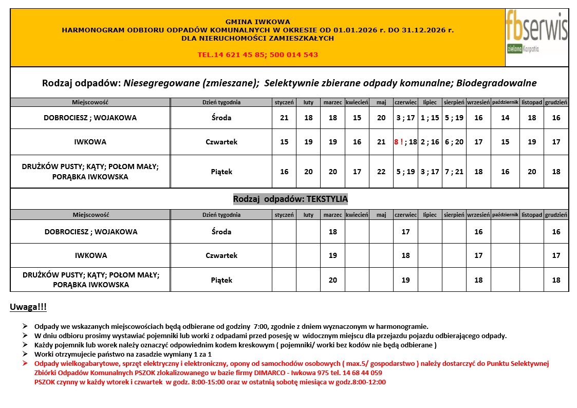 Zamieszczamy harmonogram odbioru odpadów komunalnych w Gminie Iwkowa na 2026 rok. Informujemy, iż Firma FBSerwis w dniach 02, 08 i 09 stycznia 2026r. będzie dostarczać harmonogram mieszkańcom naszej Gminy. Jednocześnie zawiadamiamy, że Firma FBSerwis w grudniu rozprowadziła worki na terenie naszej gminy. Jeśli zdarzyły się sytuacje, iż nie każde gospodarstwo otrzymało lub otrzymało niewystarczającą ilość worków, to można oddawać jeszcze odpady w dotychczasowych workach firmy Dimarco. Istotnym jest naklejenie kodu, które pozostają bez zmian, na każdym oddawanym worku. Kody zostaną rozesłane wraz z opłatami na 2026 rok, można je również odbierać w ciągu roku w Urzędzie Gminy Iwkowa lub w bazie firmy Dimarco PSZOK – Iwkowa 975.